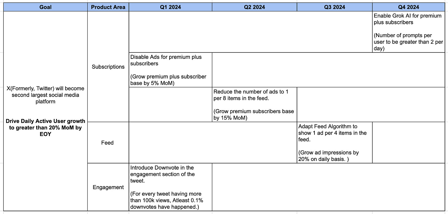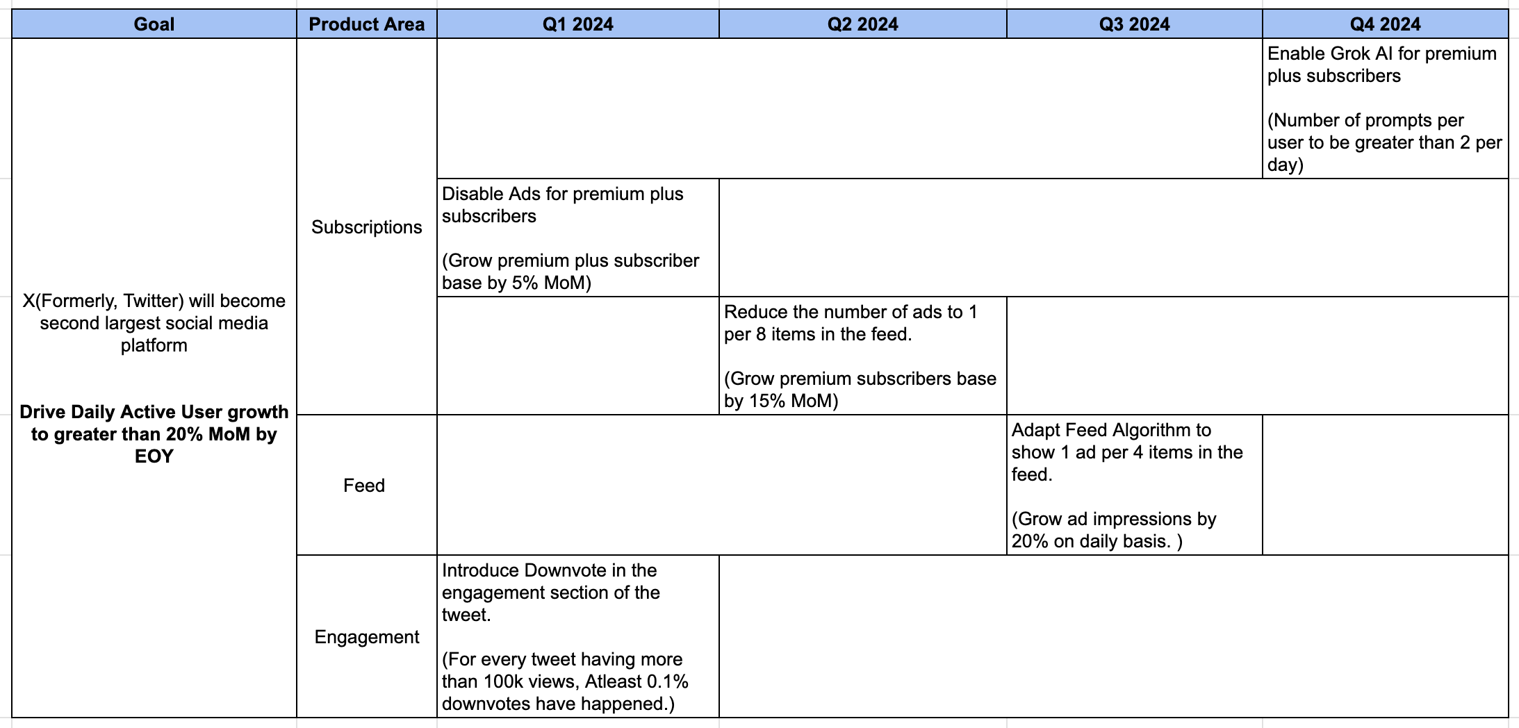 Let’s take the example of twitter (I still find it hard to call it X). What do you think can be the product goal of twitter in 2024 ? is it to grow the subscribers of premium plan or premium plus plan or will it be to grow the ad revenue ? Also, isn’t it contradictory to their own product strategy. if they want to grow premium subscribers, then their ad revenue will decline. and if ad revenue increases, then they can’t focus on getting premium subscribers. So, how do you think they should define their goal and build product strategy ?