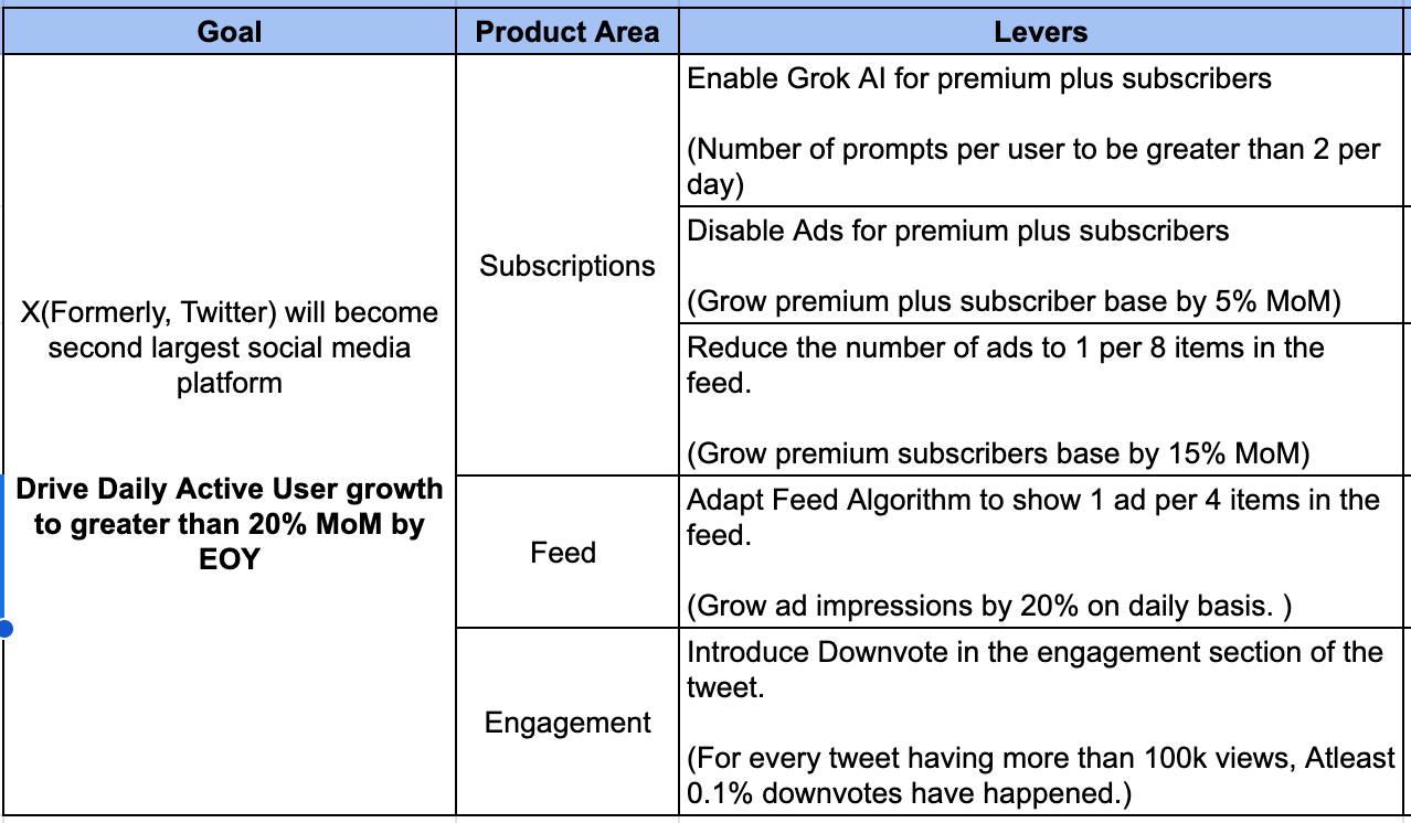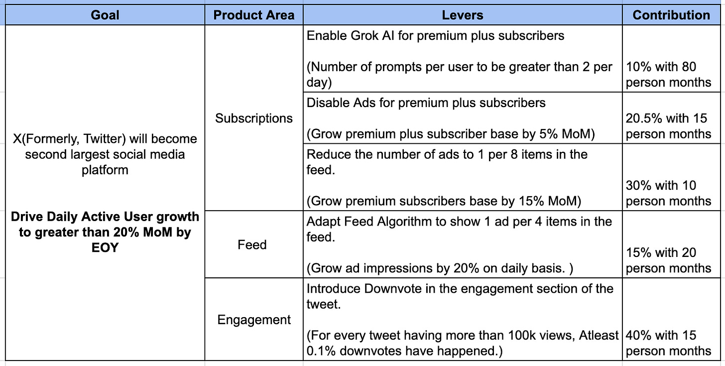 This goal is directly linked to total revenue without worrying about paid users or ad revenue. Once they define this as a goal for 2024 ( or for next 2 years), their product and business strategy will get defined across sub-product lines (subscriptions, feed algorithm, ads, engagement, SSO etc). Each product line can now build their own roadmap based on the goal.