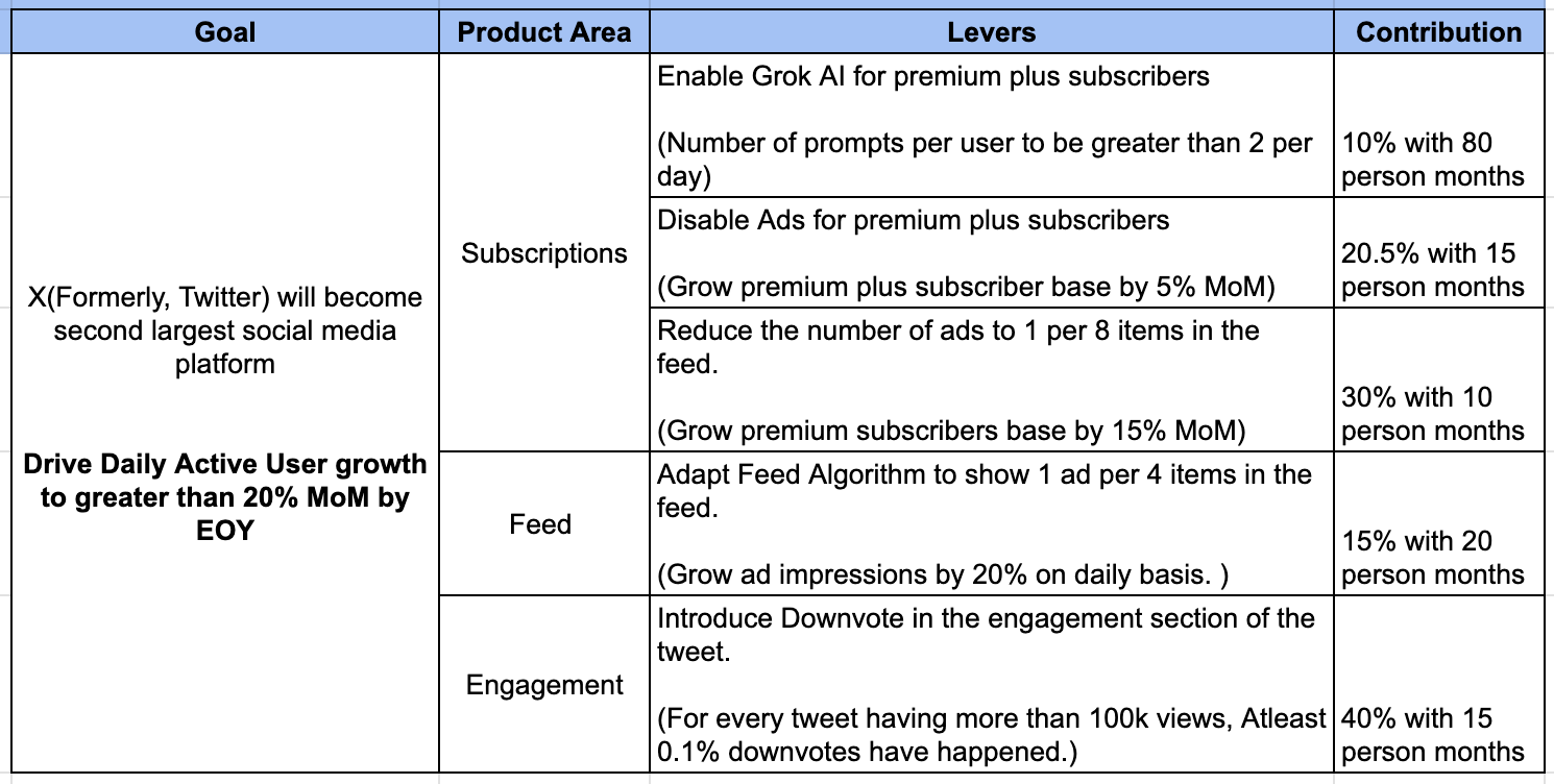 Contribution : Let’s say we can gain 1 million users by end of year assuming DAU for premium plus is 50% of total premium plus users. Total twitter users are 100 million. Effort required is 3 engineers for 5 months. but Strategic value is “Very High” or 20 percent points. So, we get 20.5% contribution with an effort of 15 person months.