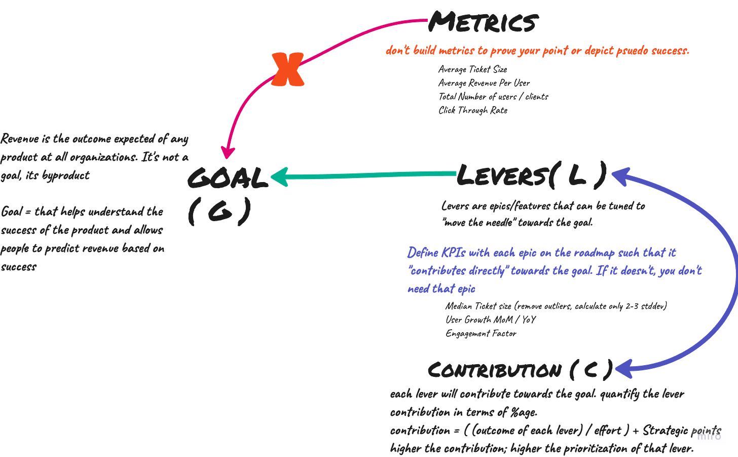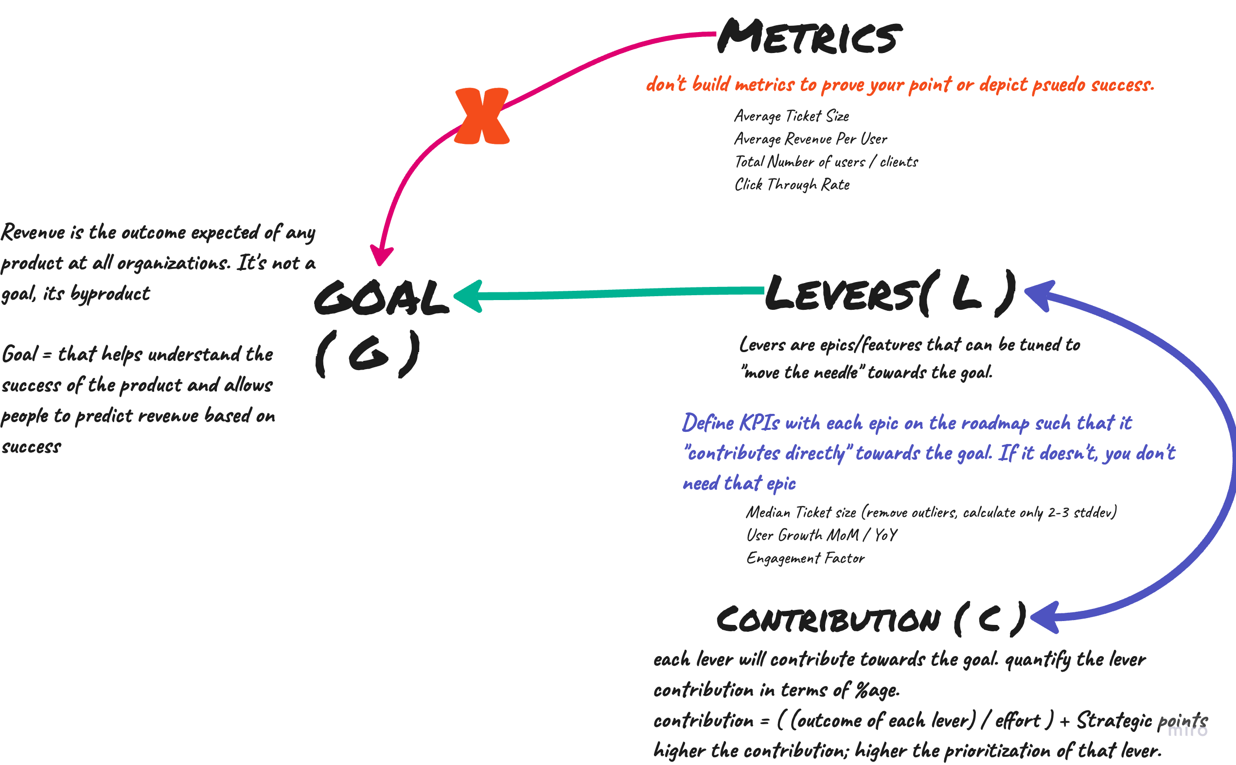 If you look at the levers, each of the work item will have a very specific KPI that doesn’t not depend on any other feature. As a product manager, you’ll still need to write detailed specifications of each feature, but more than that, you need to define the KPI in such a way that it directly impacts the goal. Proxy metrics like Average Revenue per user, Average number of subscribers, Clicks on ads etc. try to create an impression that they affect the goal but actually they are psuedo metrics that help you justify your job, not the success of the product.