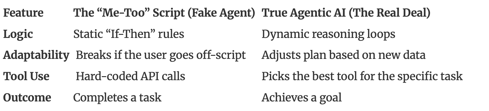 When you build a script and call it an agent, you violate the Fourth Tenet of Product: Scalability Must Be Built-In. You can’t write enough rules to cover the infinite chaos of the real world. A true agentic system doesn’t need rules; it needs goals and the ability to reason through failure.