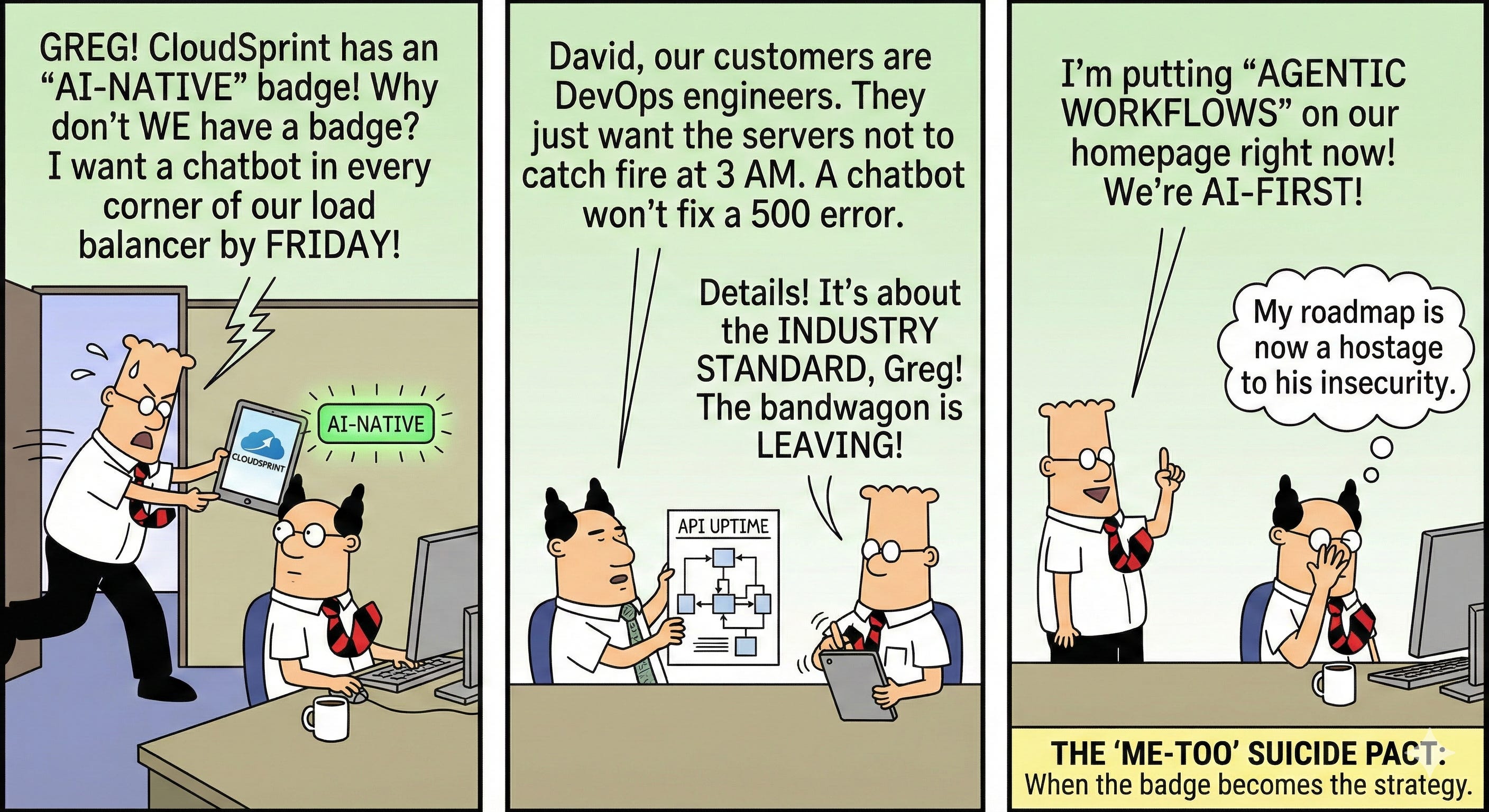 “Greg!” he shouted at his Chief Product Officer. “Why don’t we have a badge? Why aren’t we AI-Native? I just saw CloudSprint’s Series B pitch. They mentioned ‘agentic workflows’ forty-two times. I counted. We’re still talking about ‘latency’ and ‘uptime’ like it’s 2019. We are an AI-First company now. I want a roadmap by Friday that puts a chatbot in every corner of our app. If there isn’t an AI agent helping people reset their passwords, we’ve already lost.”