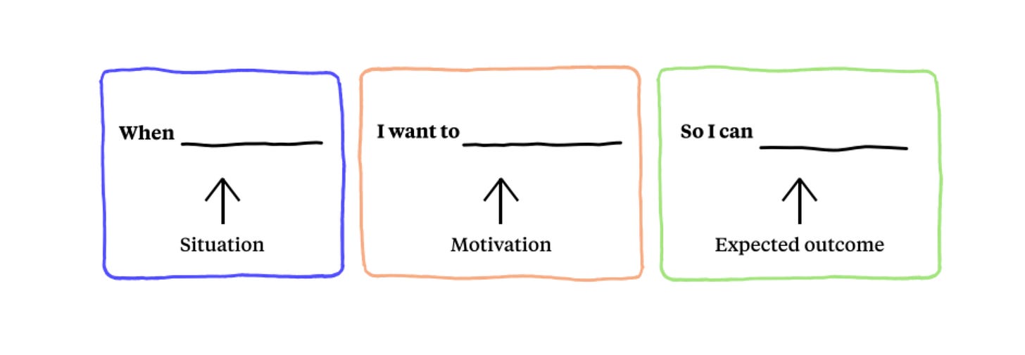 Once you identify the job, create a job statement that has 3 key components : Action, Object , Context. A simple template of a job statement can be :