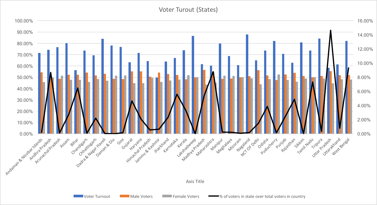 Following graph indicates the voter turnout in each state and also, outlines the male voters, female voter turnout state-wise. This graph also outlines the voter turnout in each state as a percentage of national voter turnout. This helps in identifying the states that make an impact on the election results in a significant manner.