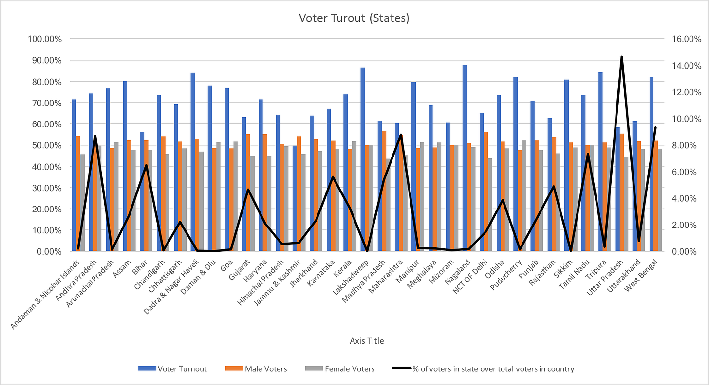 On closely analysing this graph, it figures that states like Uttar Pradesh, Maharashtra, Karnataka, Gujarat, Andhra Pradesh, Bihar, Odisha, Rajasthan, Tamil Nadu and West Bengal play a significant role in deciding the election results as they form the highest percentage of Voter turnout with respect to national voter turnout.