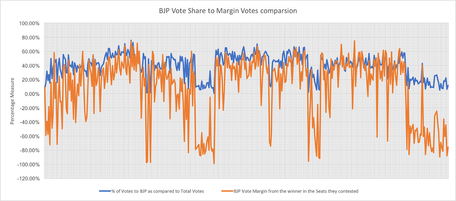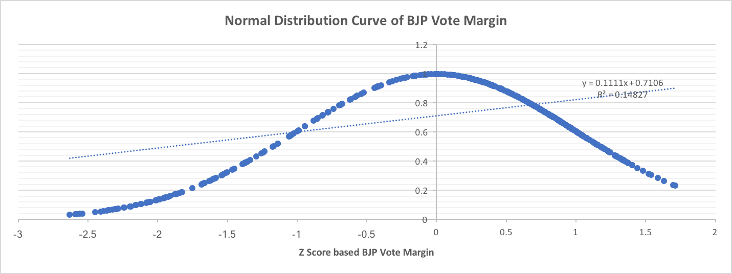 In this analysis, I considered the vote share of BJP as 0 (Zero) if BJP did not field any candidate from particular constituency and similarly, the vote margin is marked as -100%. The negative voting margin indicates BJP lost the seat while positive voting margin indicates the win. But to calculate normal distribution curve of BJP’s voting margins, the seats where BJP’s vote share is 0% is not considered as they did not field any candidate in that constituency.