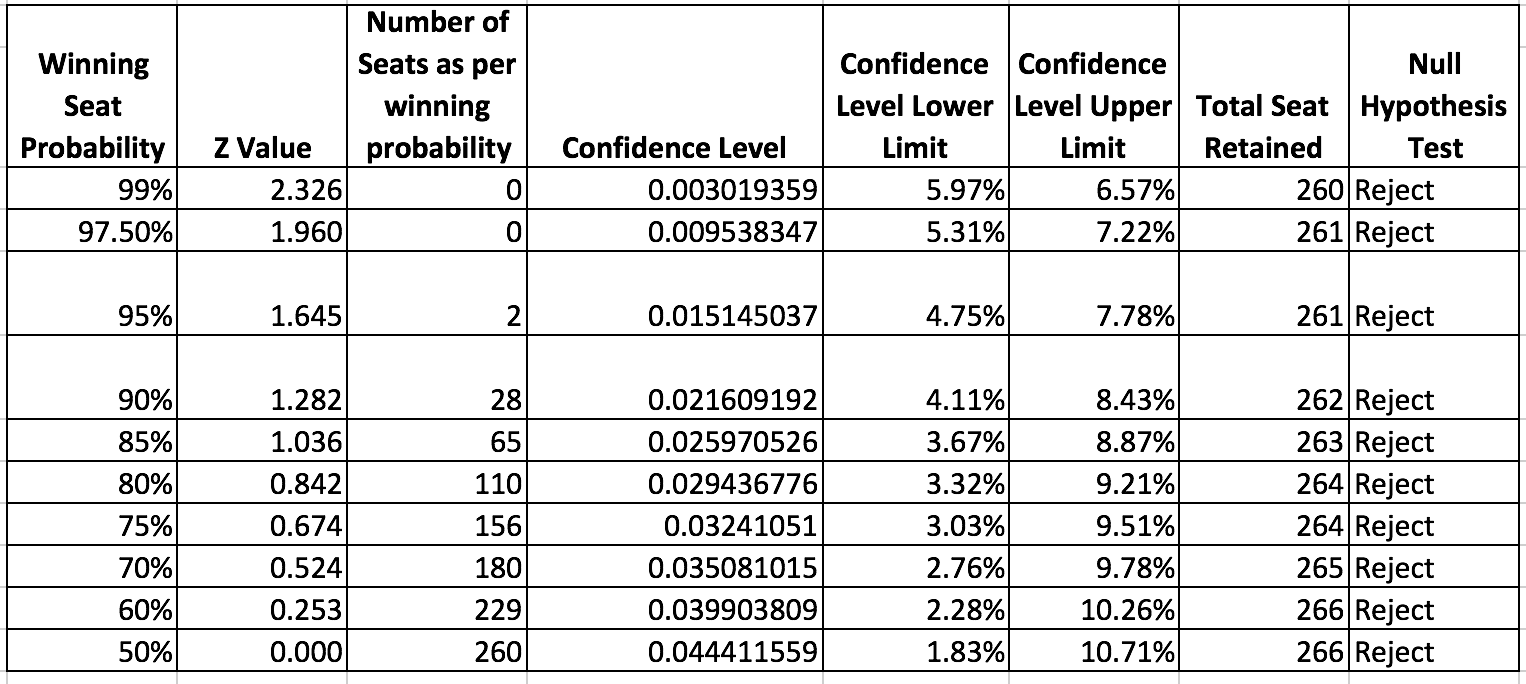 And I performed a two tailed test by using the Z value from the normal distribution curve. Also, I used the various confidence levels to find the confidence interval of number of winning seats.